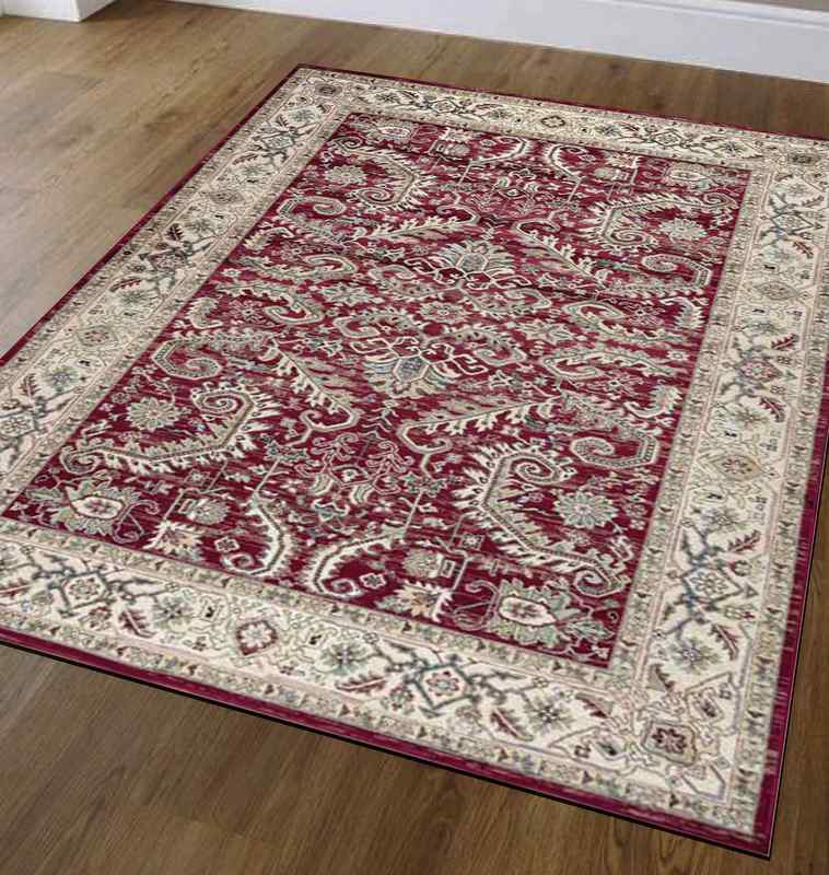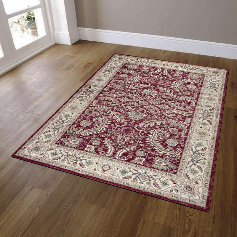 Alfombra clásica de medallón central en color granate, fabricada en viscosa y algodón.