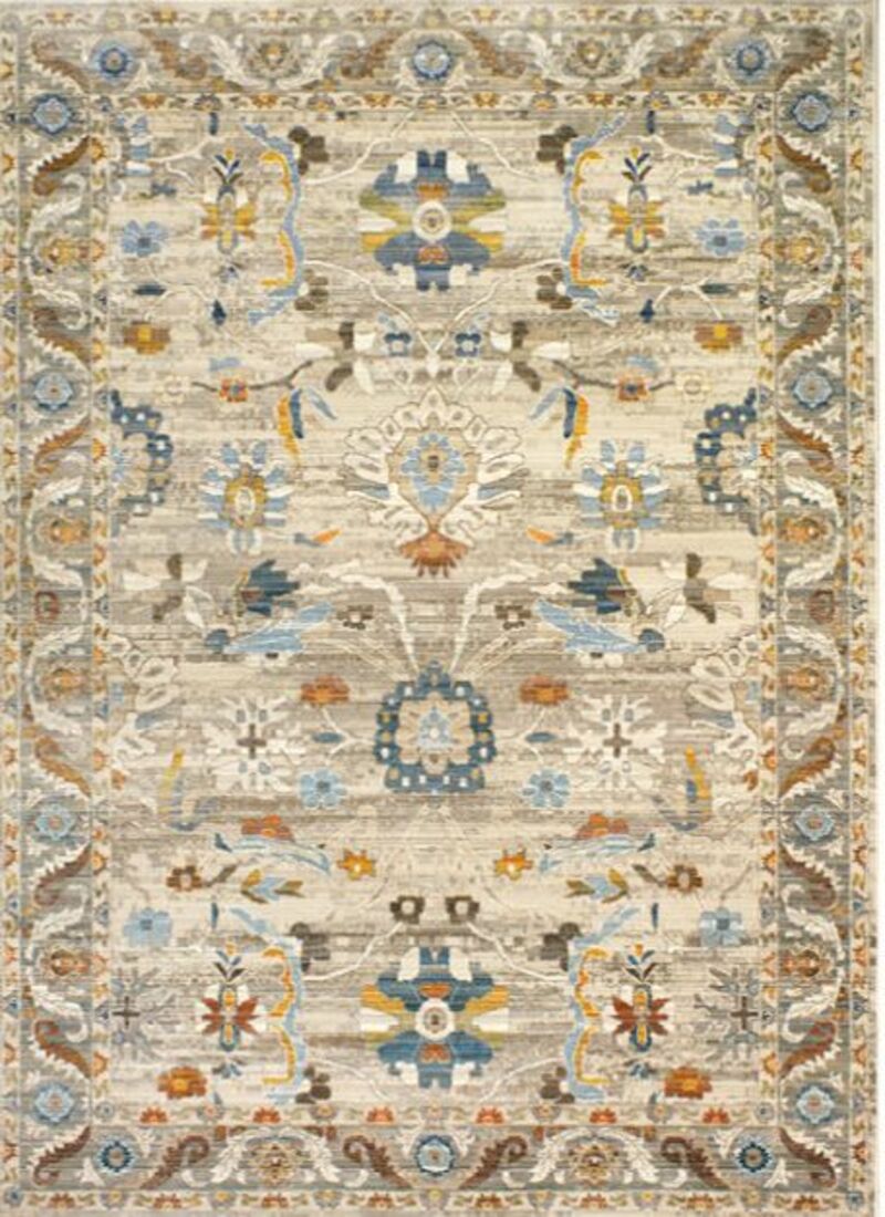 Alfombra clásica de diseño persa 854 BEIGE, en tonos Beige y azul con flecos en los extremos y unos dibujos muy definidos gracias a su alta densidad.