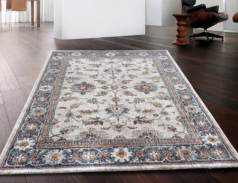 Alfombra Clásica de estilo Floral y diseño Persa, en tonos beige y azul. Una alfombra muy elegante y de gran calidad.