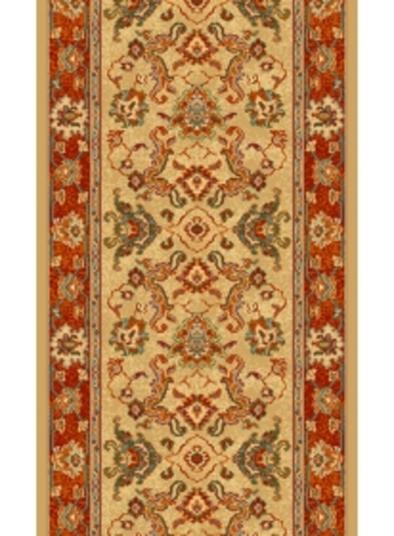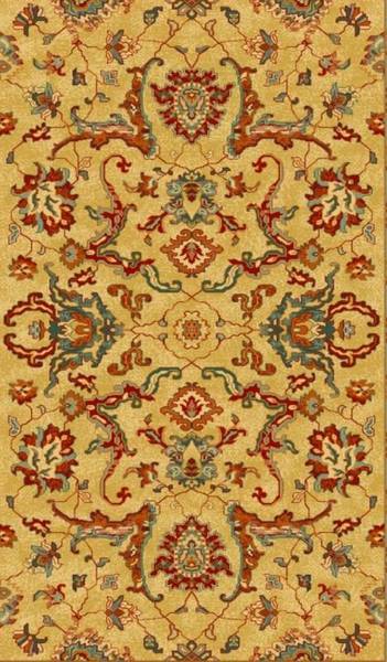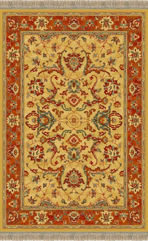 Alfombra Clásica de estilo Ziegler de color Oro acabada en flecos, fabricada en Crevillente con materiales nobles (pura lana virgen), resistente al uso y con una clasificación 5 estrellas concedida por la asociación UNIFAM (Alfombras de Crevillente).