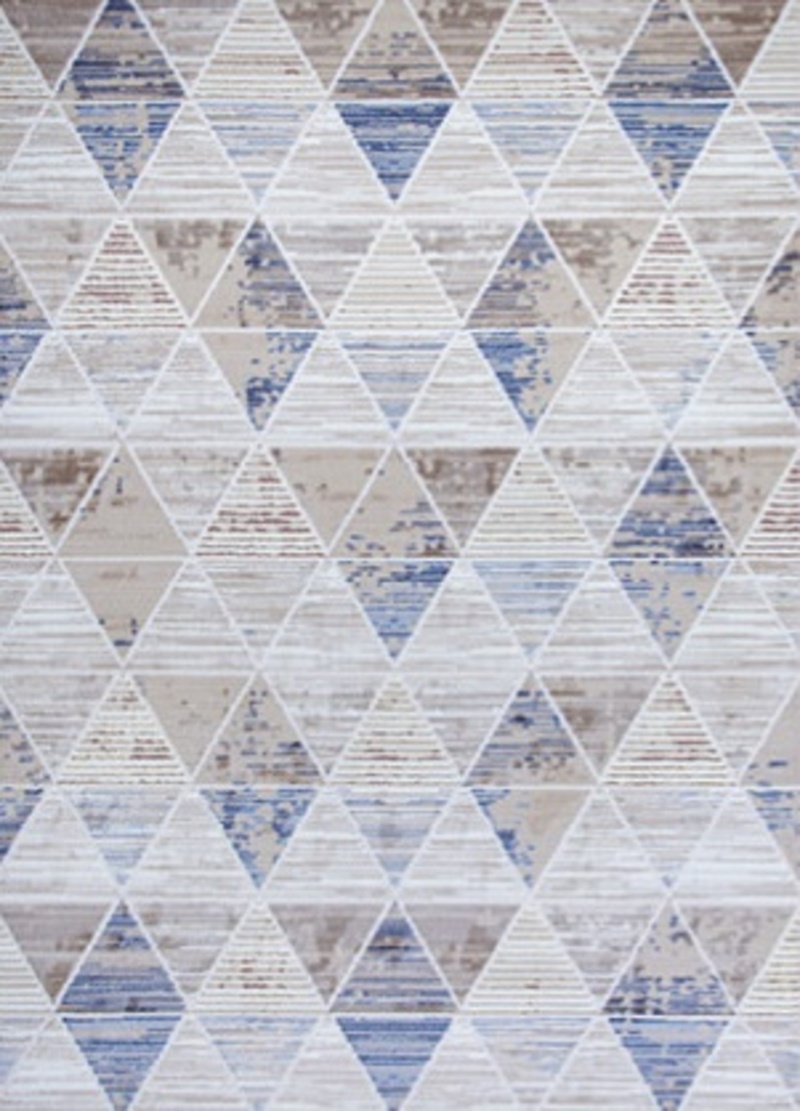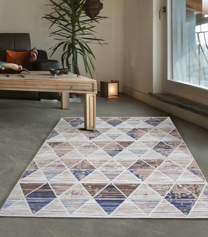 Alfombra Moderna de diseño Geométrico con rombos azul y beige. Una alfombra de tacto suave y muy resistente. Perfecta para aportar ese toque moderno y actual a tu hogar.