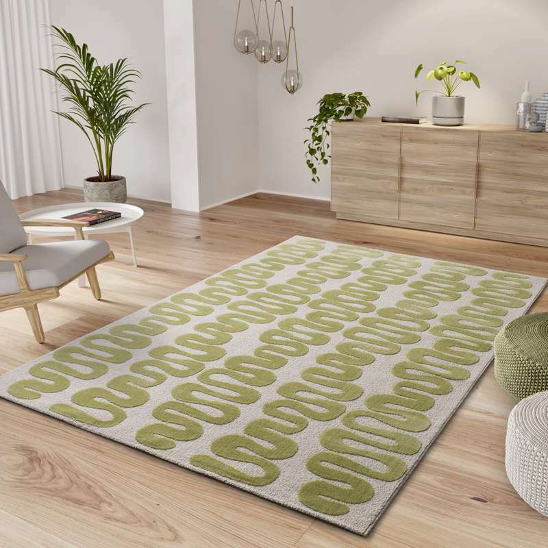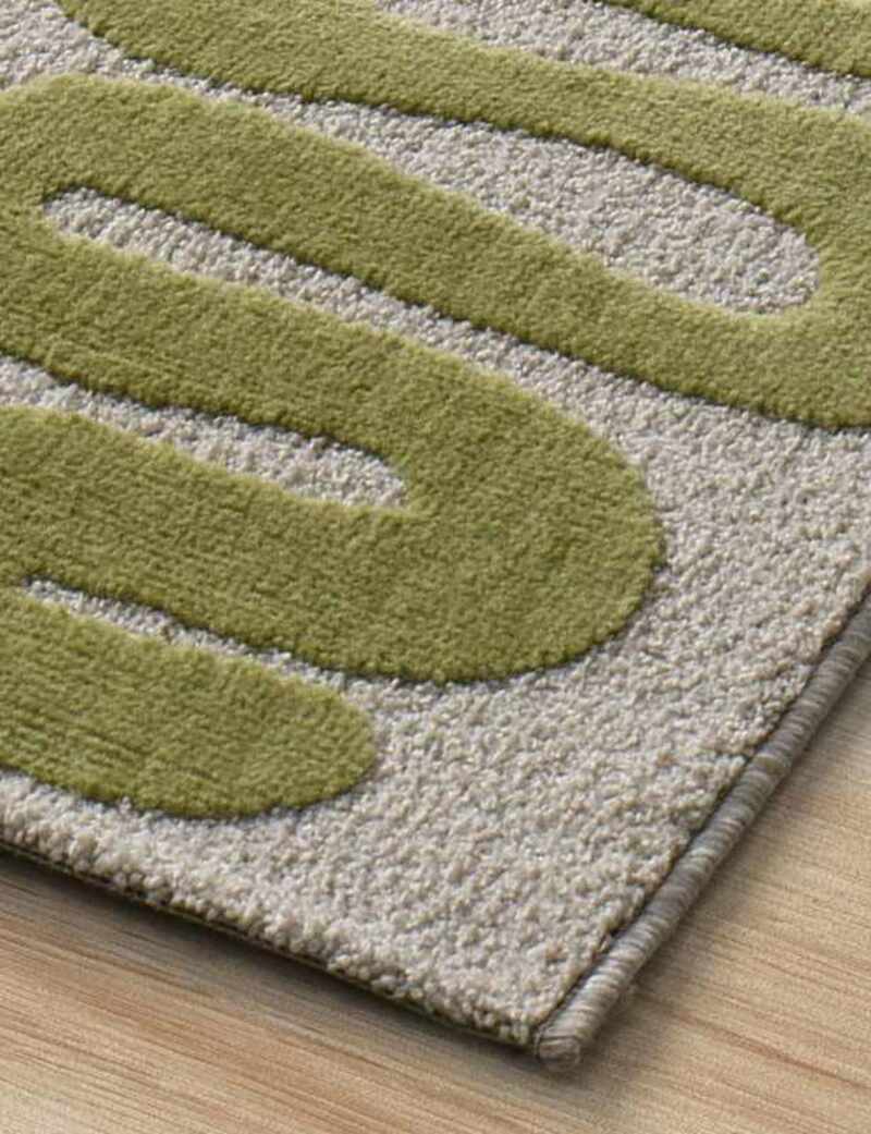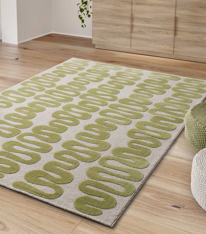 La alfombra geométrica 25409 de líneas curvas verdes sobre fondo crema, está inspirada en la decoración ornamental. Esta alfombra de salón o entrada, se ajustará perfectamente a cualquier decoración. Una alfombra con relieve, pelo corto y tacto suave, que aportará calidez a tu hogar.