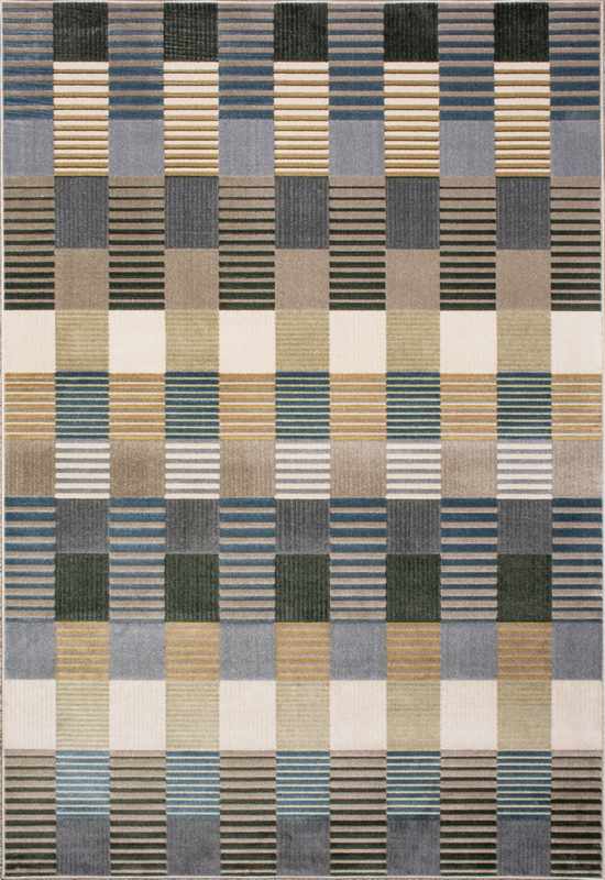 Alfombra moderna de diseño geométrico en tonos azules. Una alfombra de alta calidad con 700.000 nudos por m2.
