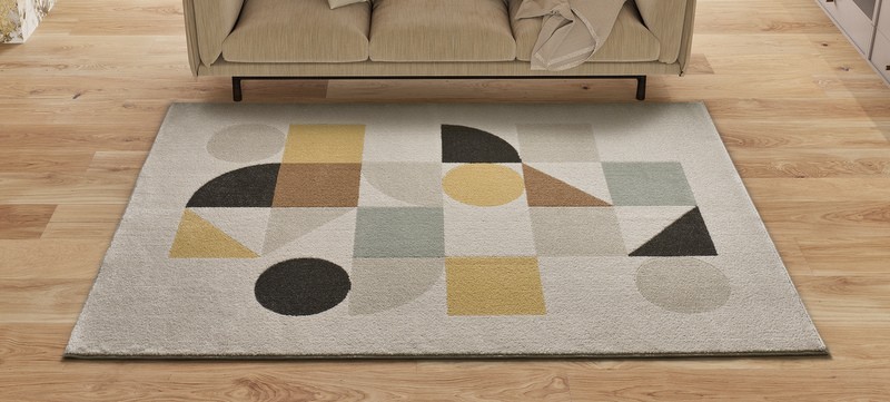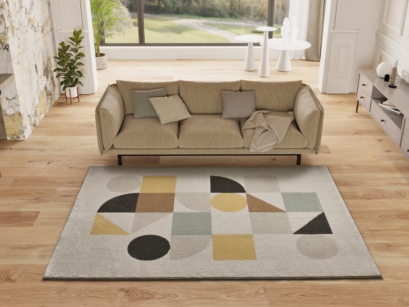 Nos encantan las formas suaves y gráficas de la alfombra DOMUS. Una alfombra Moderna en color Crema con diseños Geométricos combinando colores empolvados.