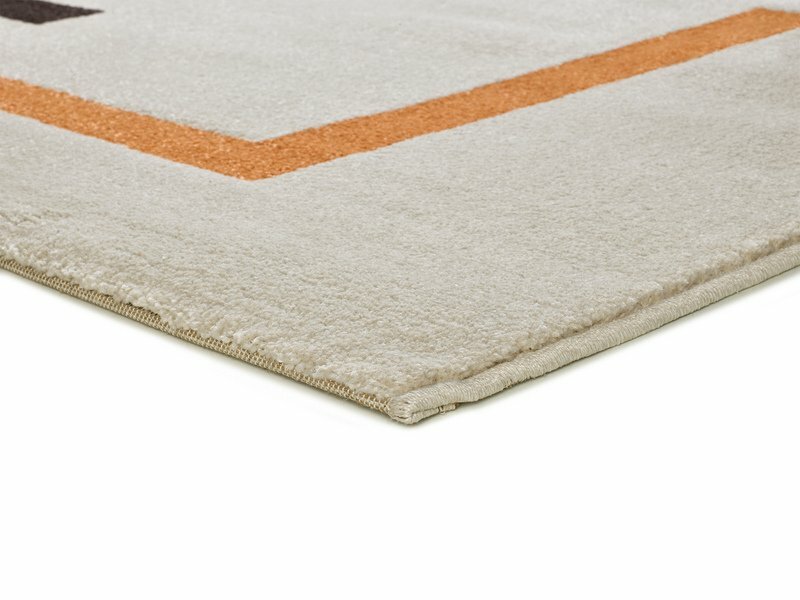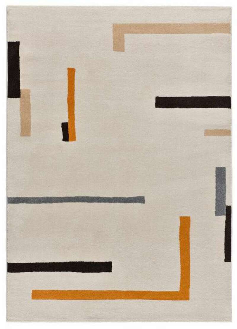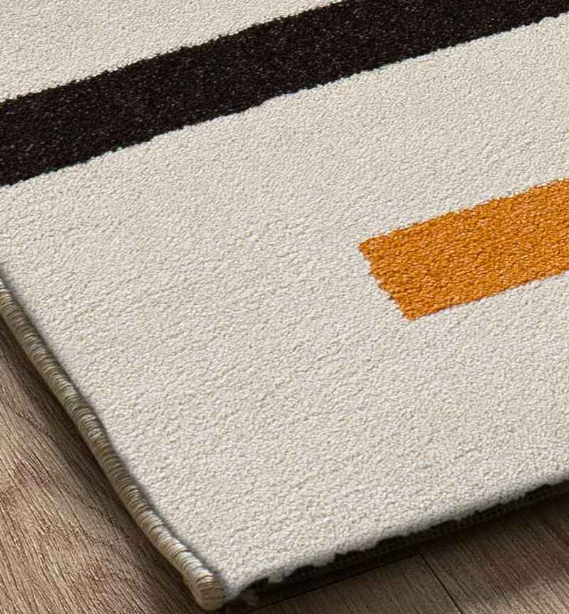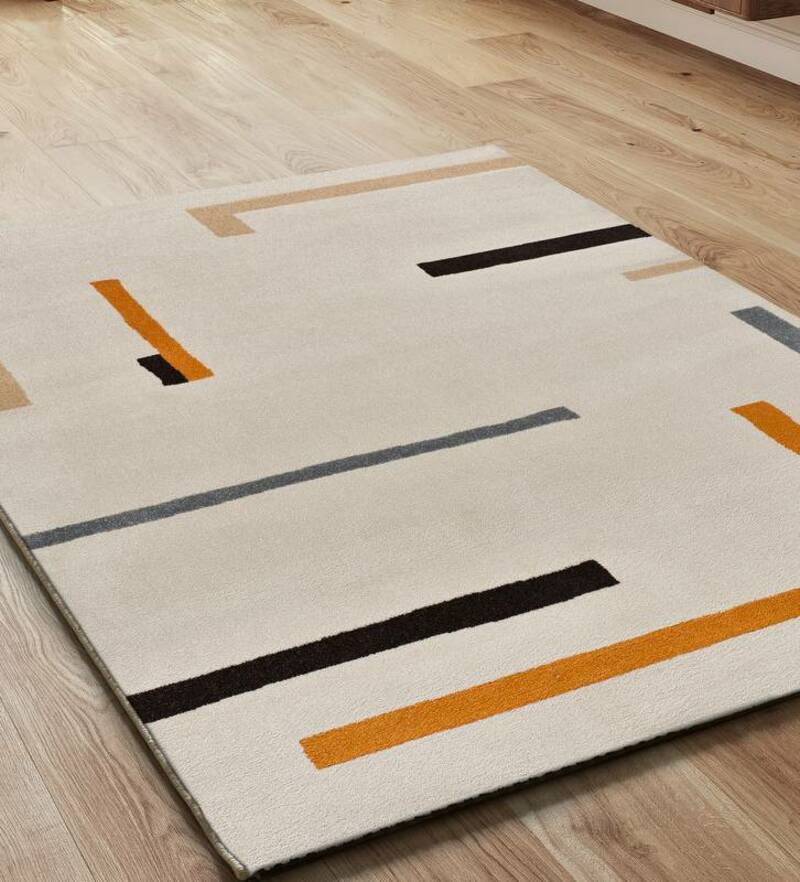 La alfombra geométrica Lessia Línea en tonos naranja y crema, combina un diseño basado en líneas arquitectónicas y bloques de color estratégicos. Esta alfombra es ideal para quienes buscan una decoración limpia, equilibrada y con un toque de vitalidad cromática.