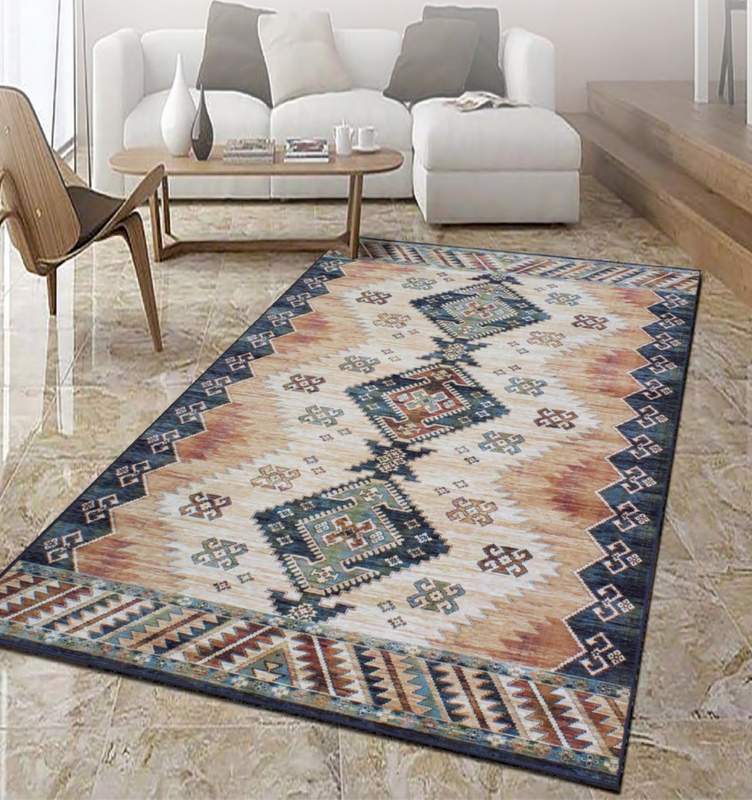 Pasillera Étnica tipo Kilim Turco de diseño Geométrico en tonos Azul y Beige. Alfombra lavable y soporte antideslizante.