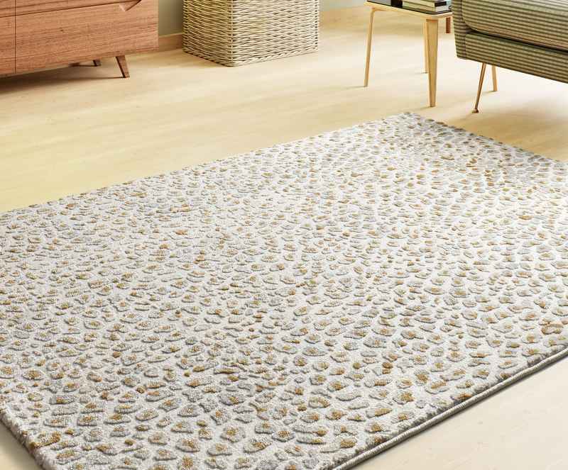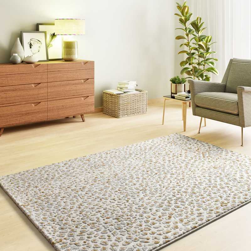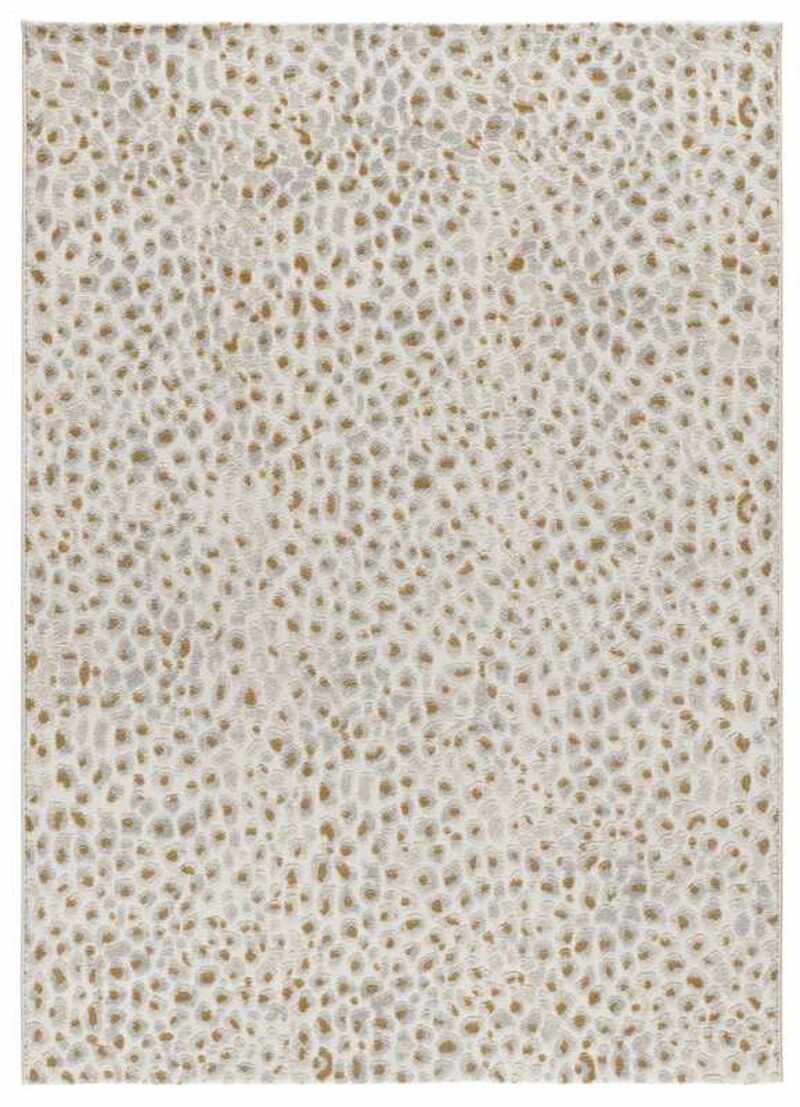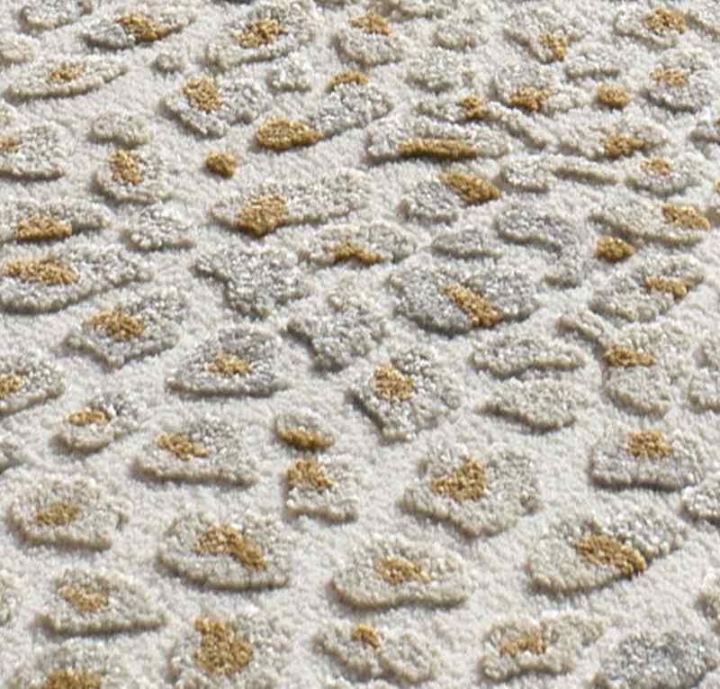 La alfombra moderna con diseño de leopardo 13001 es la pieza perfecta para quienes buscan transformar su salón o dormitorio en un espacio sofisticado y contemporáneo. Su diseño presenta un patrón orgánico inspirado en el animal print, utilizando una base de tonos plata y gris que se entrelaza con detalles en crema y mostaza para crear un efecto visual dinámico.