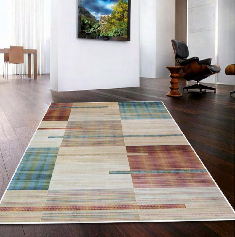 Alfombra y Pasillera Moderna de diseño Geométrico combinando Beiges Calderas y Azules. Lavable y soporte antideslizante.